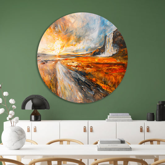 Impressionistische waterval bij zonsondergang schilderij aluminium muurcirkel