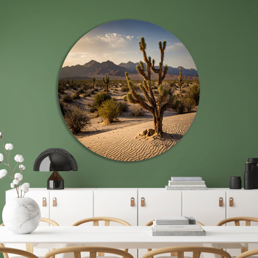 Woestijnlandschap bij zonsondergang met bergen aluminium muurcirkel