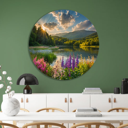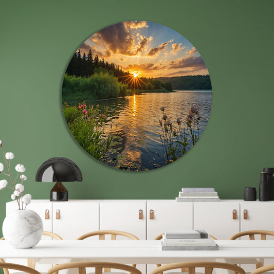 Zonsondergang over bloemenveld en meer aluminium muurcirkel