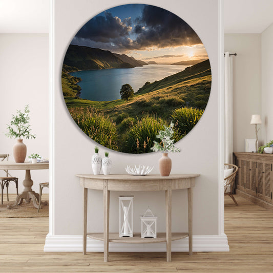 Zonsondergang bij schilderachtig meer met heuvels aluminium muurcirkel