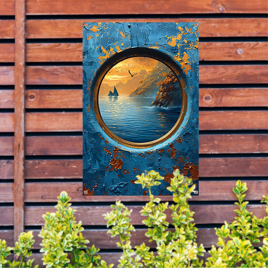 Zeegezicht met schepen en vogel bij zonsondergang tuinposter