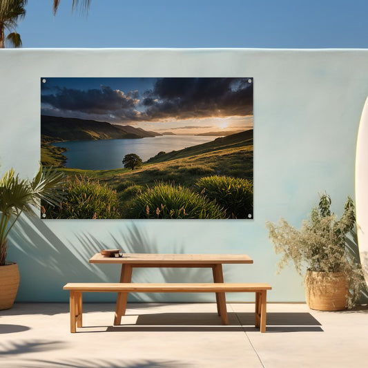 Zonsondergang bij schilderachtig meer met heuvels tuinposter