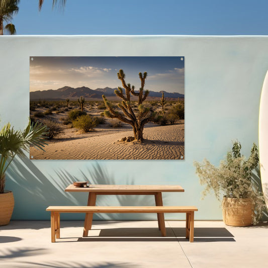 Woestijnlandschap bij zonsondergang met bergen tuinposter