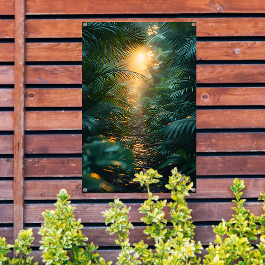 Zonnig pad door weelderig regenwoud tuinposter