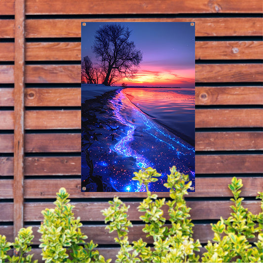 Magisch gloeiend strand bij zonsondergang tuinposter