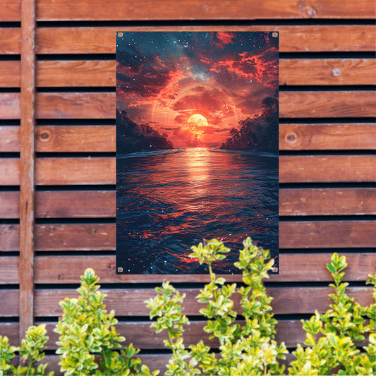 Kosmische rivier bij zonsondergang op buitenaardse planeet tuinposter
