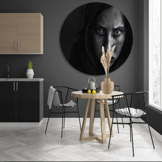 Zwart-wit portret van intense vrouw aluminium muurcirkel