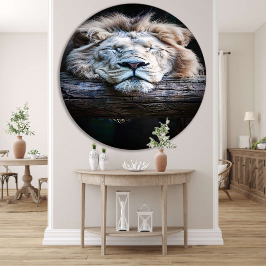 Zwart-wit portret van slapende leeuw aluminium muurcirkel