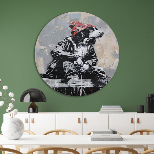 Zwart-witte hond met rode muts op betonnen richel forex muurcirkel