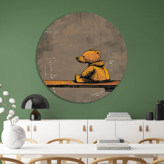 Eenzame Teddybeer op Bankje in Verlaten Landschap forex muurcirkel