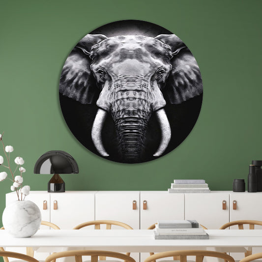Olifant in monochroom zwart en wit aluminium muurcirkel