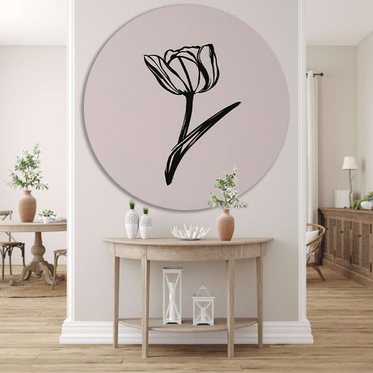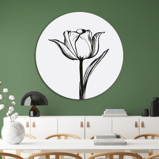 Minimalistische tulp in zwart-wit lijnenspel aluminium muurcirkel