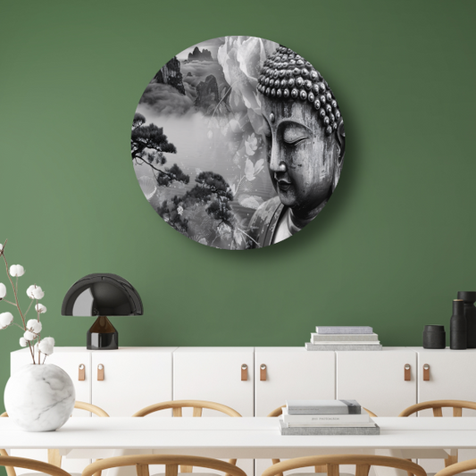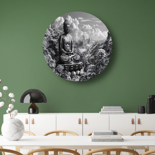 Serene Boeddha in monochroom berglandschap forex muurcirkel