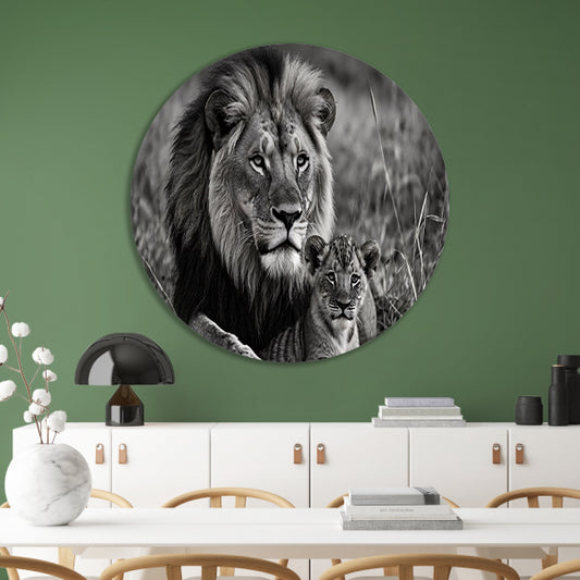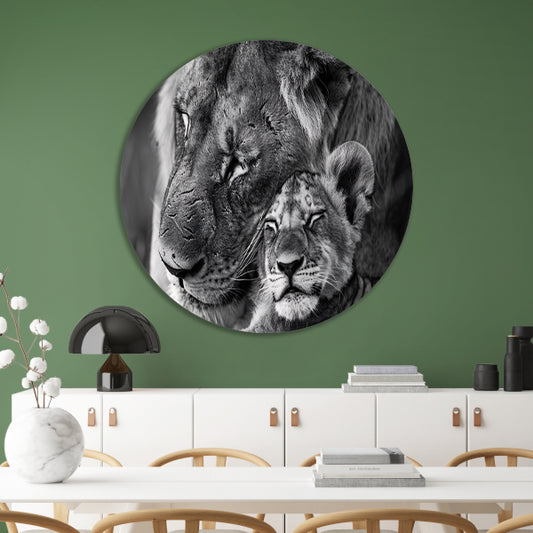 Majestueuze leeuwin met haar welp in zwart-wit aluminium muurcirkel