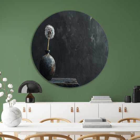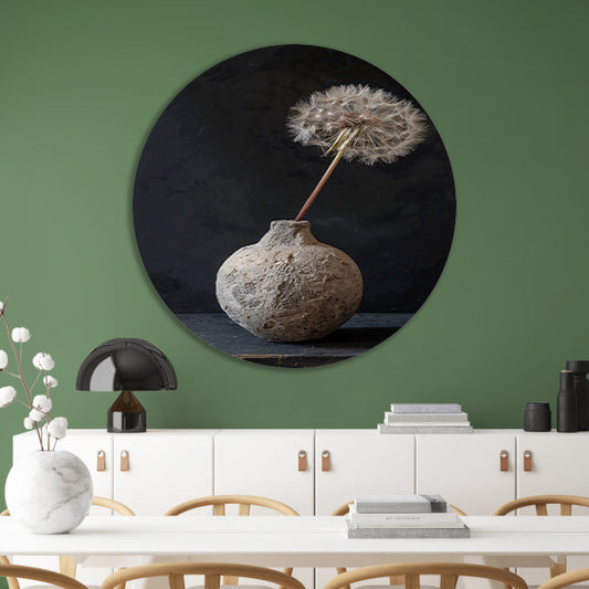 Eenzame paardenbloem in antieke vaas aluminium muurcirkel
