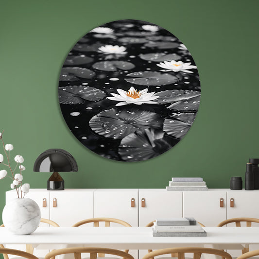 Zwart-wit foto van waterlelies op water aluminium muurcirkel