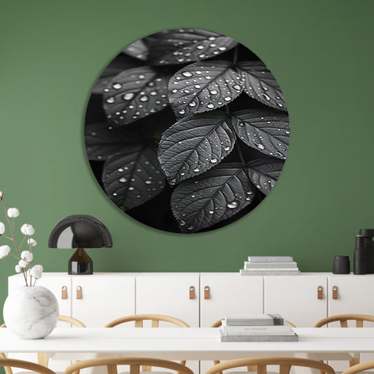 Zwart-witfoto van dauwdruppels op bladeren aluminium muurcirkel