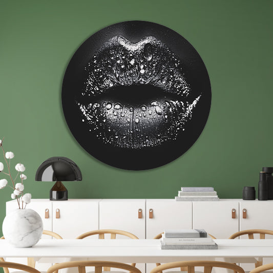 Close-up van glinsterende lippen in zwart en wit aluminium muurcirkel
