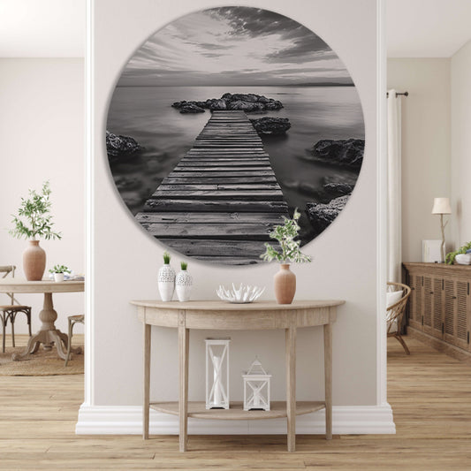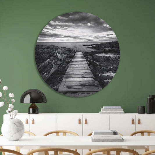 Houten steiger tussen rotsen naar open zee aluminium muurcirkel