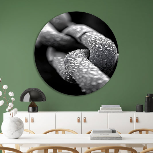 Zwart-witfoto van dauwdruppels op een ketting aluminium muurcirkel