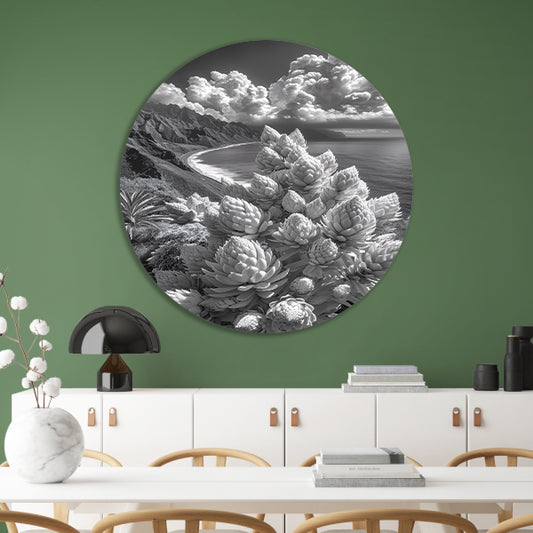 Zwart-wit kustlandschap met bloeiende planten aluminium muurcirkel
