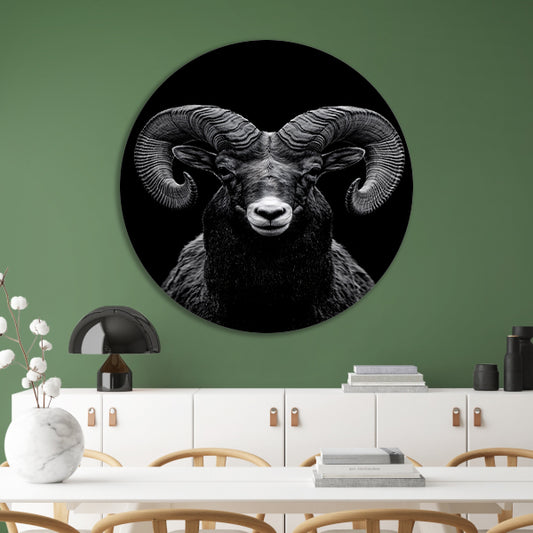 Indrukwekkend zwart-wit portret van een majestueuze ram forex muurcirkel
