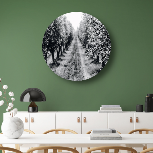 Zwart-wit olijfboom landschap aluminium muurcirkel