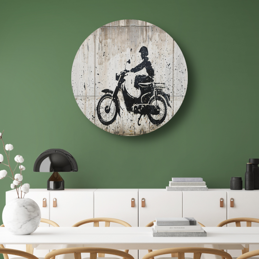 Silhouet motorrijder tegen betonnen achtergrond aluminium muurcirkel