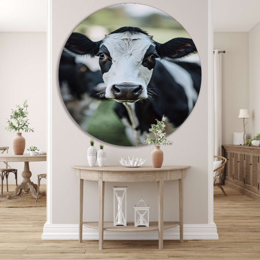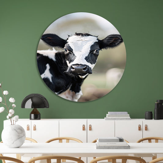Portret van een nieuwsgierige koe aluminium muurcirkel
