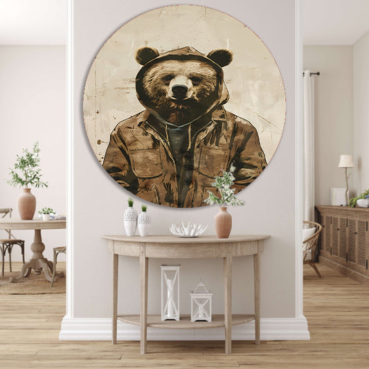 Beer met Hoodie en Jas in Sepia aluminium muurcirkel