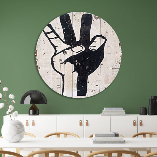 Zwart-witte hand op verweerd hout aluminium muurcirkel