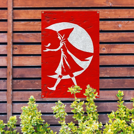 Vrouw in Rode Mantel Wandelt Onder Maan tuinposter