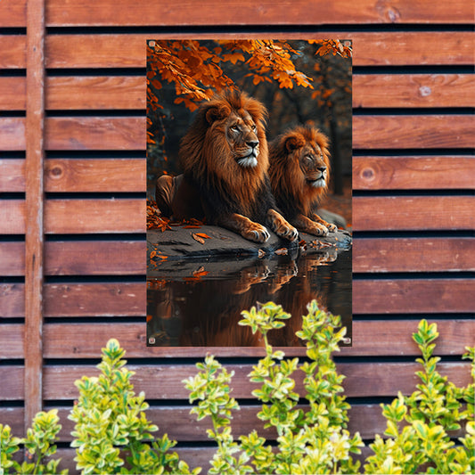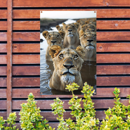 Leeuwen in de waterpoel tuinposter