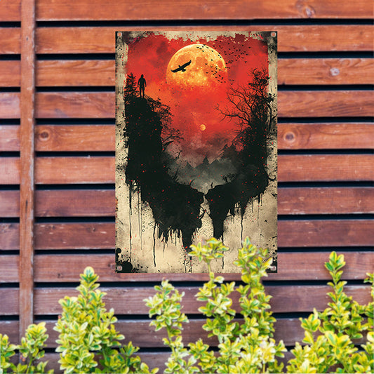 Eenzame figuur op klif onder bloedrode maan tuinposter