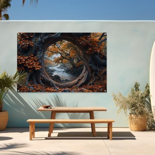 Oude boom bij rivier tuinposter