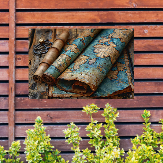 Opgerolde Wereldkaart op Houten Tafel. tuinposter