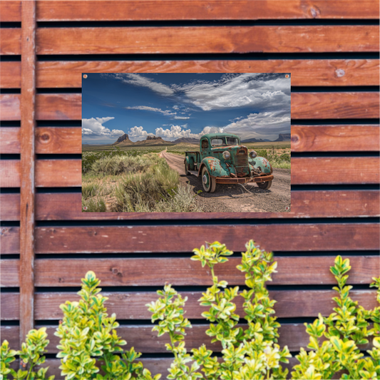 Eenzame vrachtwagen op verlaten weg tuinposter