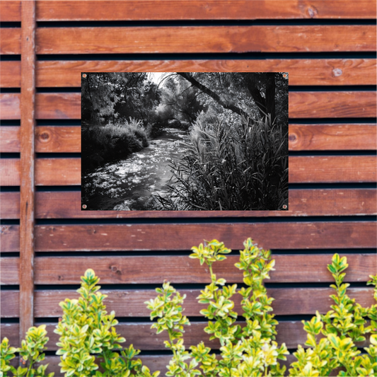 Abstract zwart-wit leeuwenportret met verfspetters tuinposter