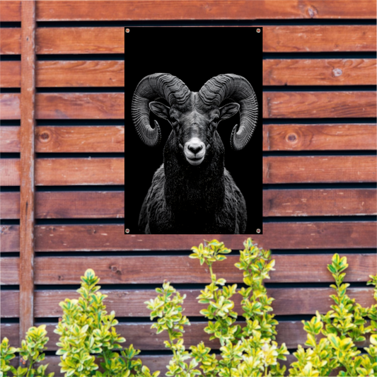 Indrukwekkend zwart-wit portret van een majestueuze ram tuinposter