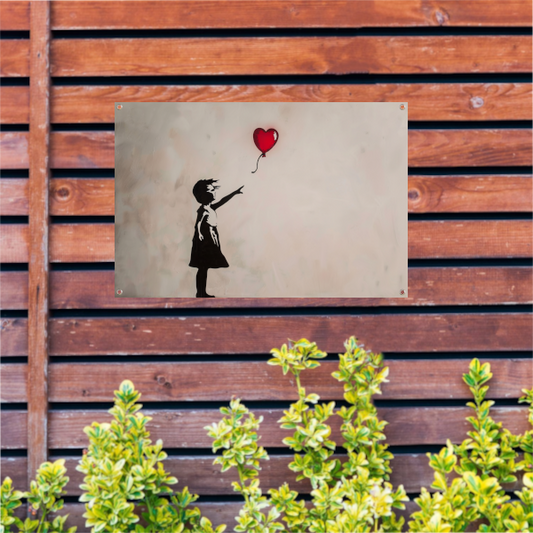 Silhouet van meisje met rode hartvormige ballon tuinposter