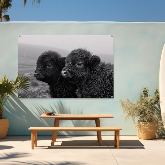 Twee kalveren in monochrome mistige ochtend tuinposter