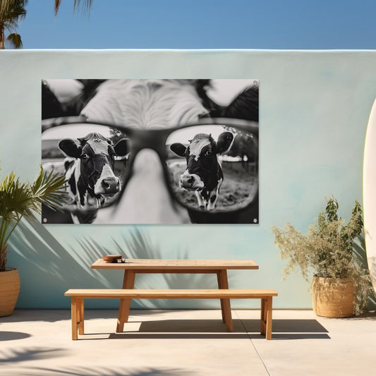 Reflectie van een nieuwsgierige koe in een bril tuinposter