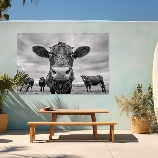 Nieuwsgierige Koe in Zwart-Wit Portret tuinposter