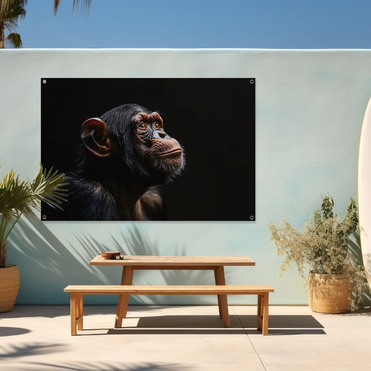 Gedetailleerd chimpanseeportret met donkere achtergrond tuinposter
