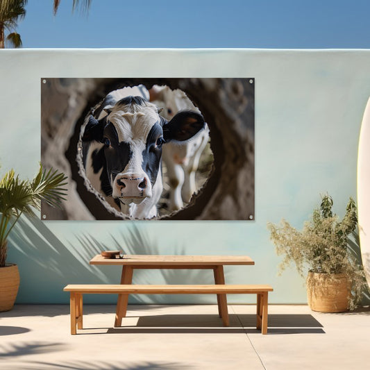 Nieuwsgierige Koe in Beton Cirkel tuinposter