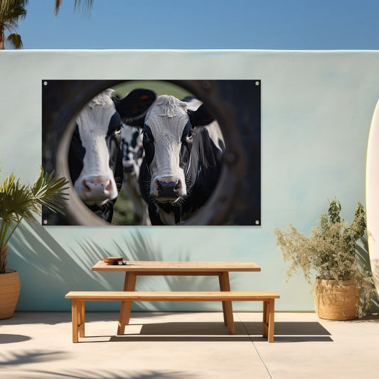 Nieuwsgierige koeien kijken door sleutelgat tuinposter