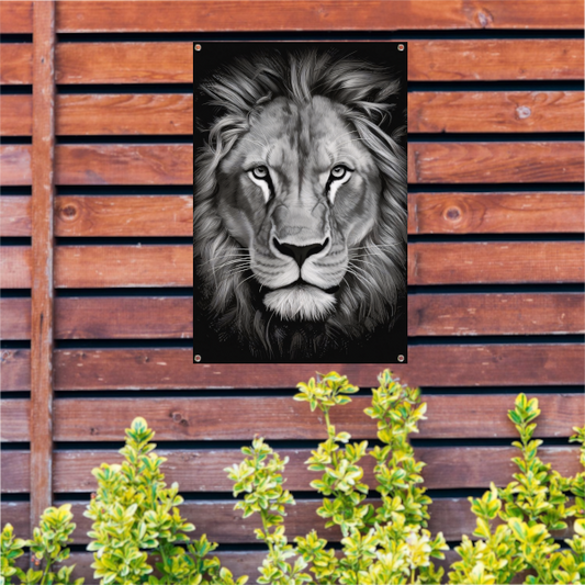 De Monochrome Blik van de Majestueuze Leeuw tuinposter