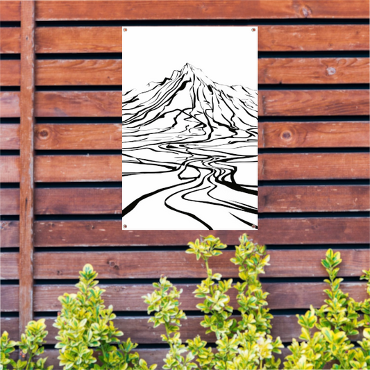 Abstracte berglijnen en kronkelende rivier tuinposter