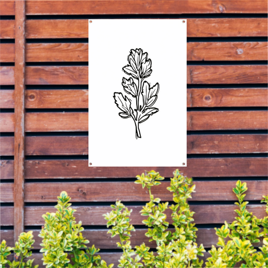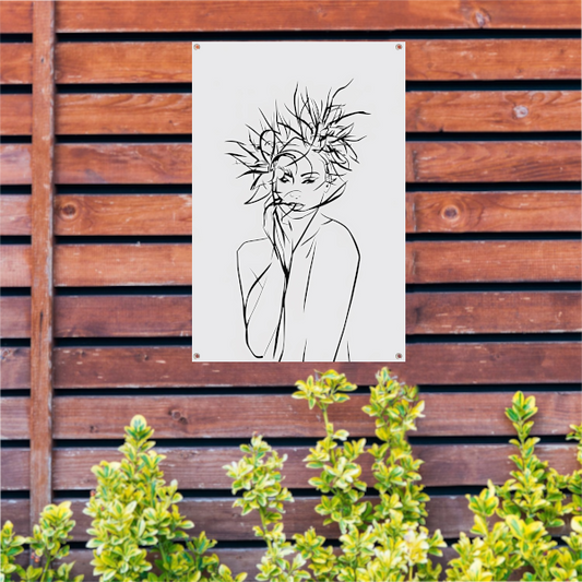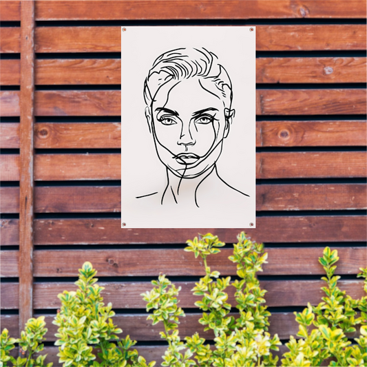 Zwart-wit lijntekening van vrouwengezicht tuinposter