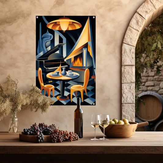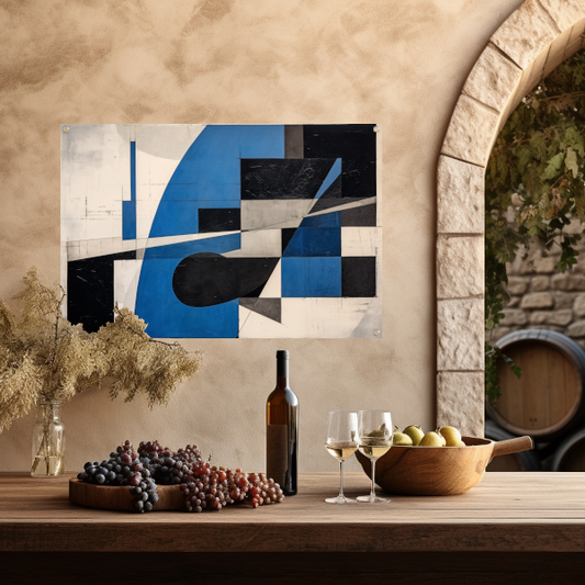 Minimalistische lijnencompositie in rood, blauw en geel tuinposter
